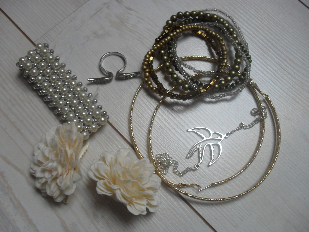 Dit zijn de rondslingerende sieraden op m’n kamer die ik er aan wil hangen en op wil leggen. Zou het passen? En voor als je de ring en het armbandje met de vogel herkent; die heb ik gewonnen op de blog van Daniëlle. Daniëlle als je dit leest: Nogmaals bedankt, ben er heel erg blij mee! En nu maar vullen, haha: