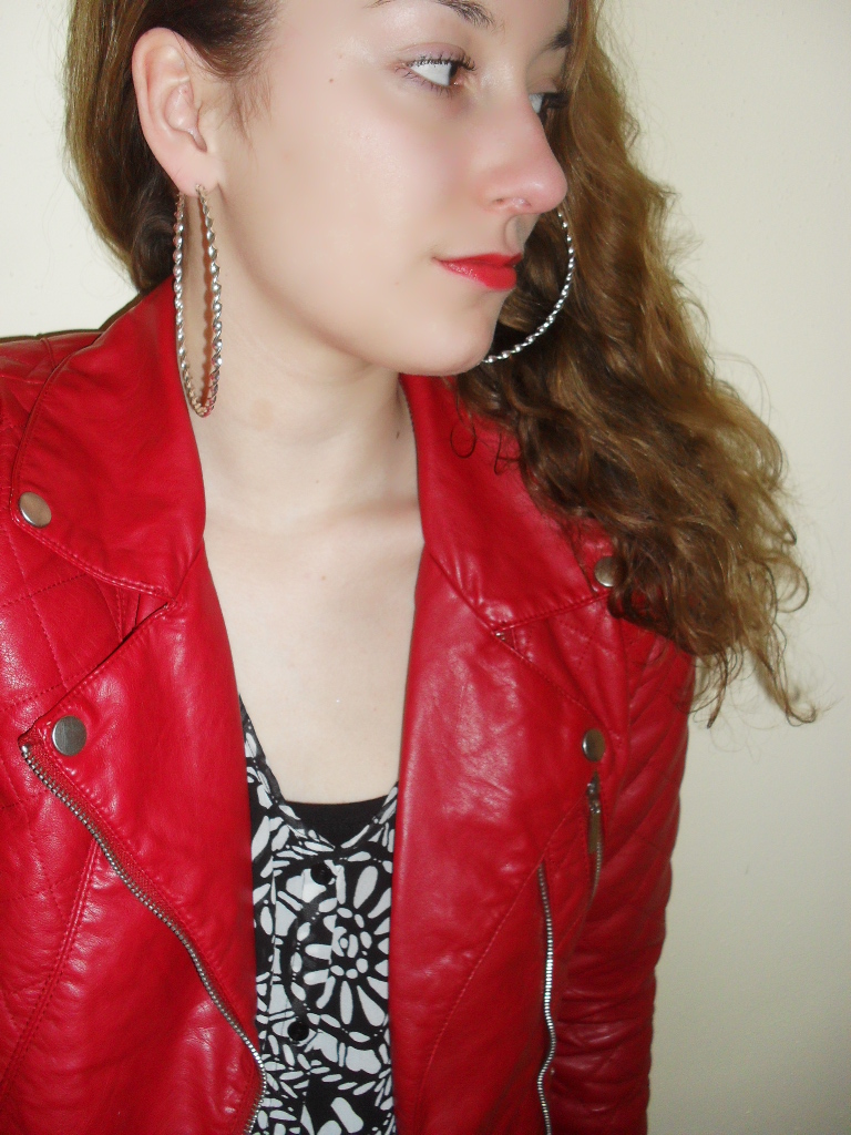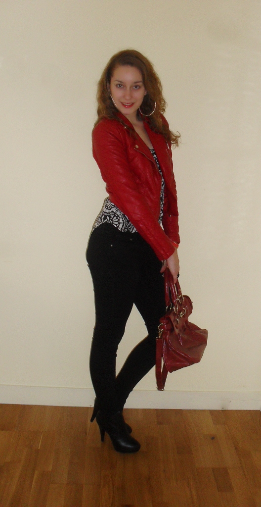 Ik heb de rest van mijn outfit redelijk rustig en basic gehouden, zodat het rood er echt lekker uit kon knallen. Ik vind de combinatie zelf erg leuk, maar niet heel bijzonder. Het jasje zit verrassend genoeg erg lekker, omdat hij gedeeltelijk uit tricot stof bestaat. De outfit is lief, maar ook stoer: vooral door de laarsjes en de oorbellen. Een luchtige blouse eronder, basic zwarte jeans, wat rood op de lipjes en klaar is kees!