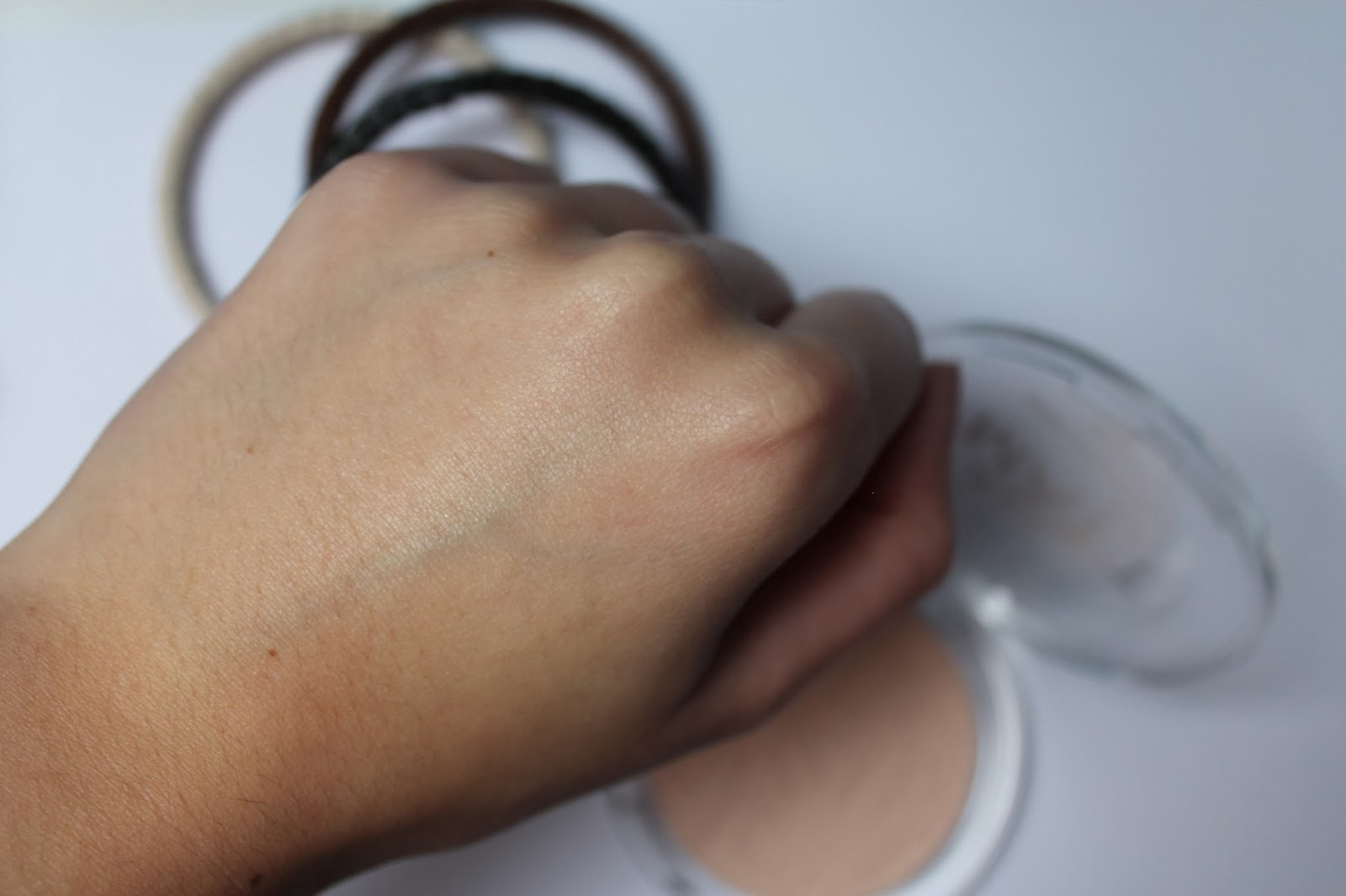 Mijn hand zonder poeder en mijn hand met poeder. Zoals je ziet matteert de poeder goed, de glans van mijn hand is niet meer te zien. Ook is mijn hand een tintje lichter geworden. Ideaal als je foundation nét een beetje te donker is. Met een lichte poeder kun je dit herstellen.